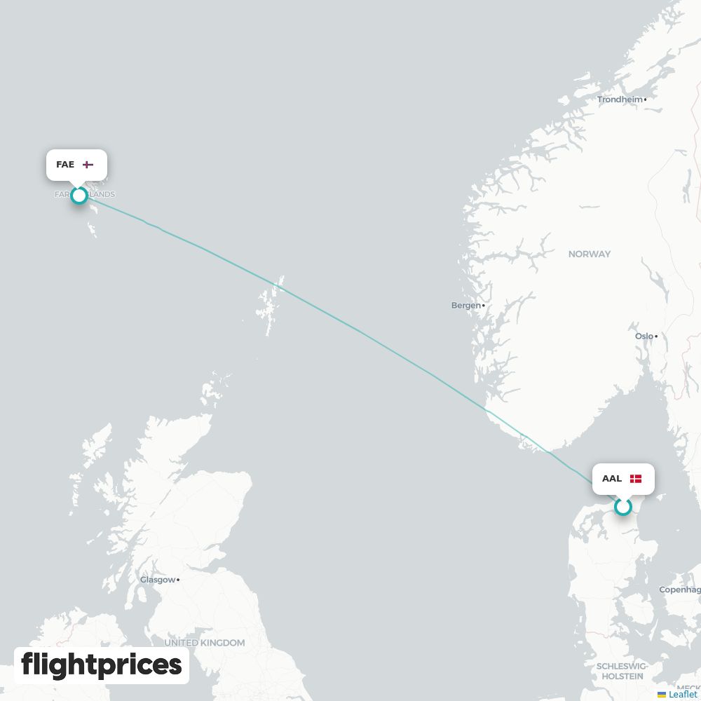 Et hurtigt overblik over Aalborg (AAL) til Sørvágur (FAE) — laveste og typiske priser, prisinterval, billigste måneder og ugedage, selskaber på ruten samt normal rejsetid fra Danmark til Færøerne.
