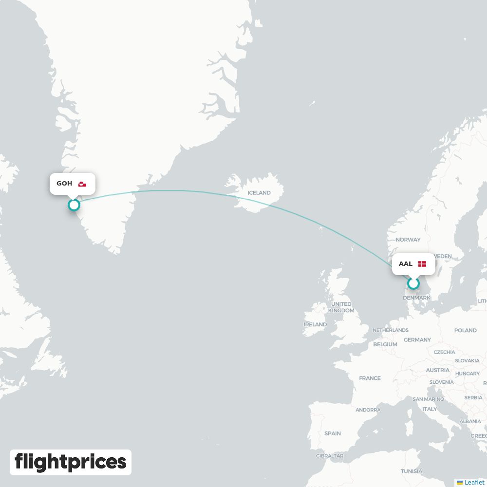 Et hurtigt overblik over Aalborg (AAL) til Nuuk (GOH) — laveste og typiske priser, prisinterval, billigste måneder og ugedage, selskaber på ruten samt normal rejsetid fra Danmark til Grønland.