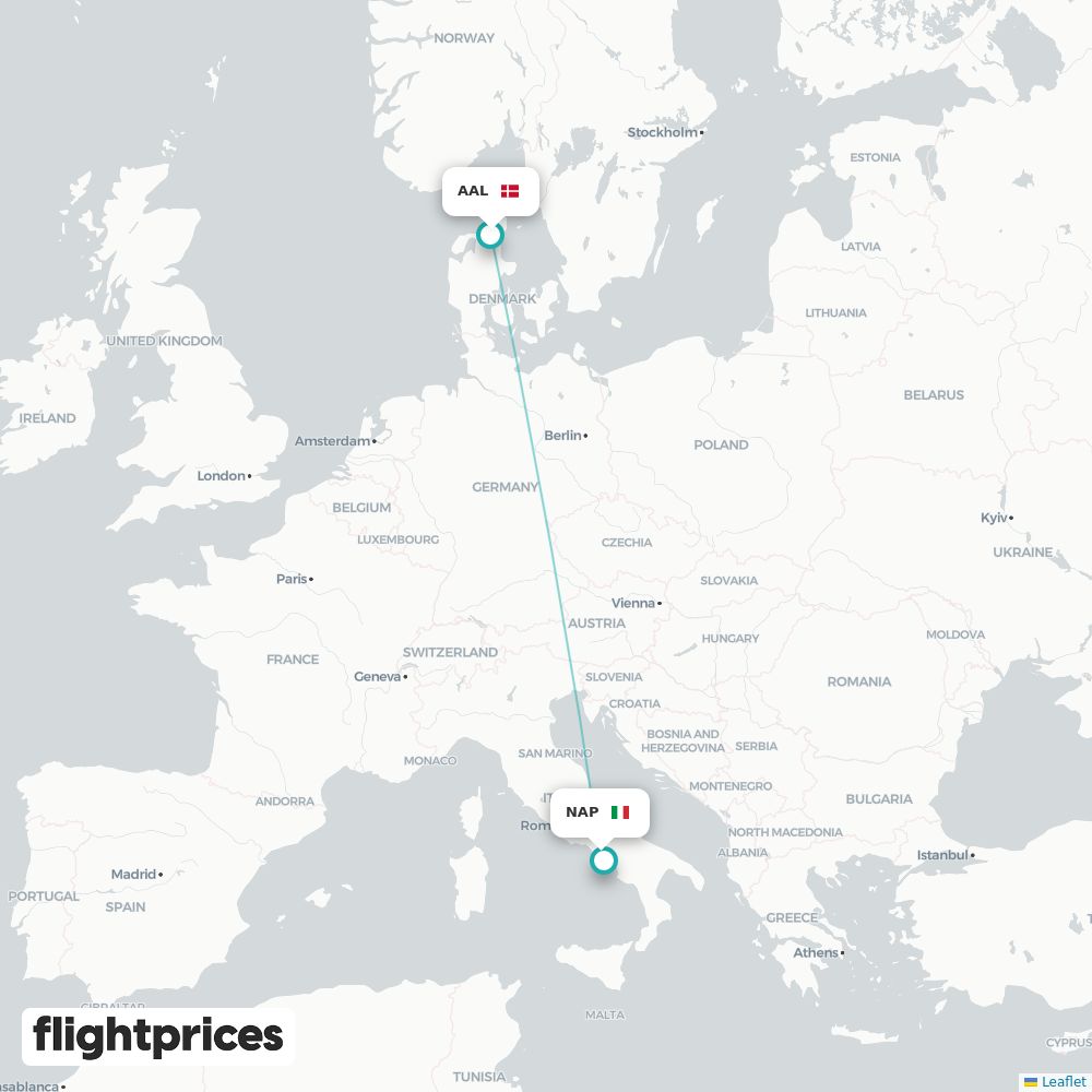 Et hurtigt overblik over Aalborg (AAL) til Napoli (NAP) — laveste og typiske priser, prisinterval, billigste måneder og ugedage, selskaber på ruten samt normal rejsetid fra Danmark til Italien.