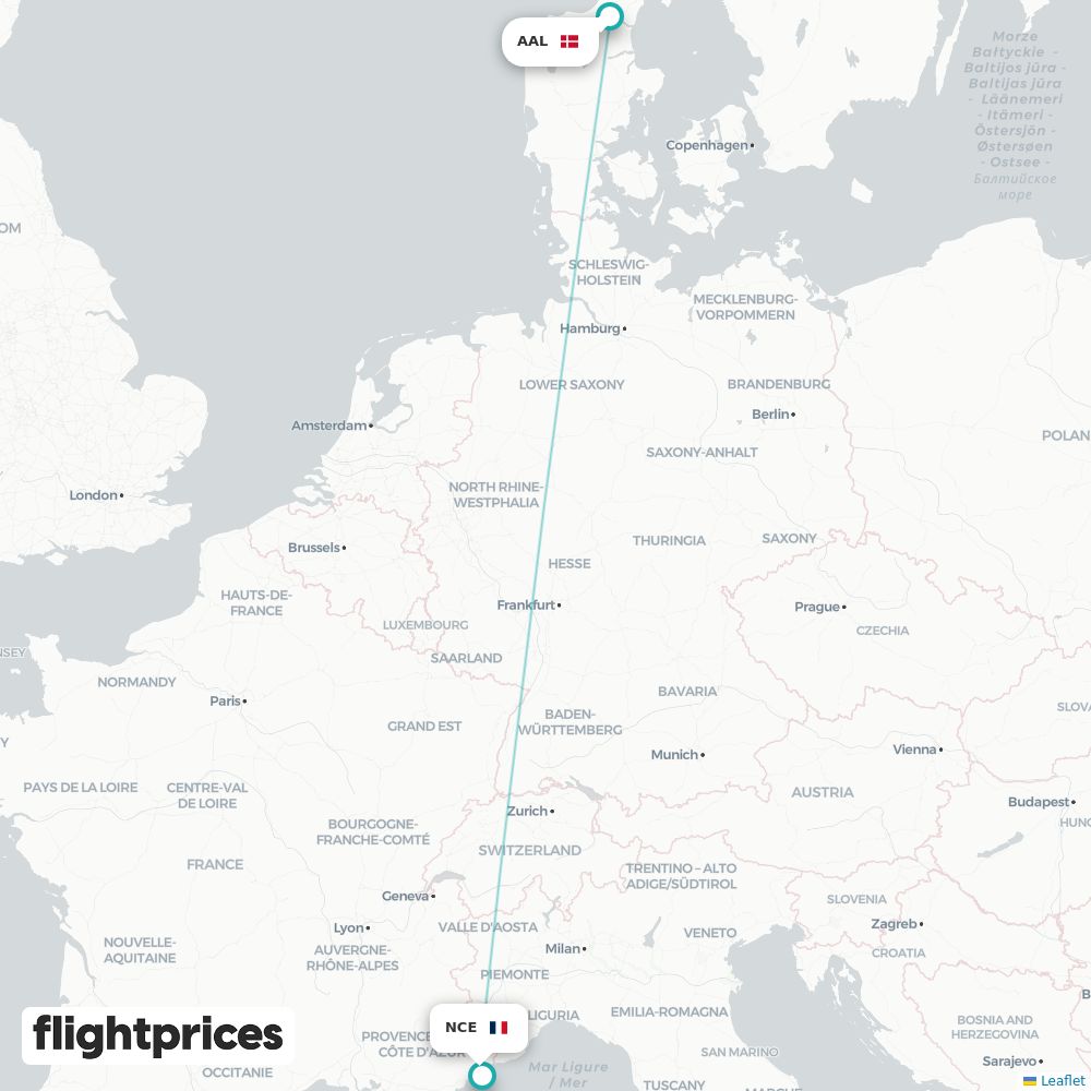 Et hurtigt overblik over Aalborg (AAL) til Nice (NCE) — laveste og typiske priser, prisinterval, billigste måneder og ugedage, selskaber på ruten samt normal rejsetid fra Danmark til Frankrig.