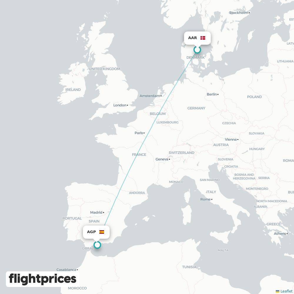 Et hurtigt overblik over Aarhus (AAR) til Malaga (AGP) — laveste og typiske priser, prisinterval, billigste måneder og ugedage, selskaber på ruten samt normal rejsetid fra Danmark til Spanien.