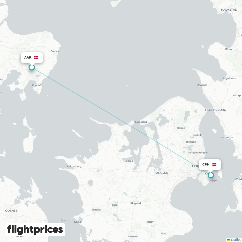 Et hurtigt overblik over Aarhus (AAR) til København (CPH) — laveste og typiske priser, prisinterval, billigste måneder og ugedage, selskaber på ruten samt normal rejsetid.