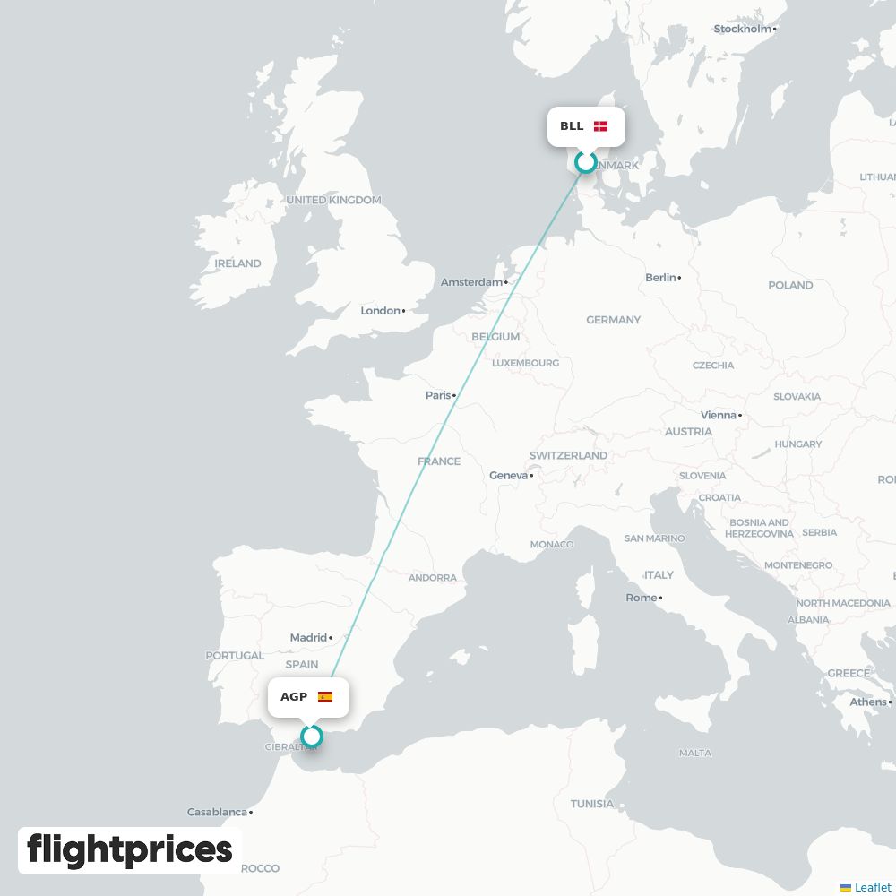 Et hurtigt overblik over Billund (BLL) til Malaga (AGP) — laveste og typiske priser, prisinterval, billigste måneder og ugedage, selskaber på ruten samt normal rejsetid fra Danmark til Spanien.
