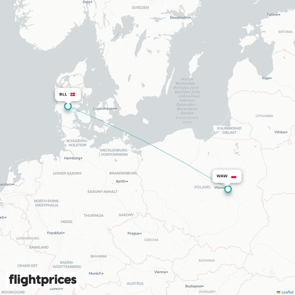 Et hurtigt overblik over Billund (BLL) til Warszawa (WAW) — laveste og typiske priser, prisinterval, billigste måneder og ugedage, selskaber på ruten samt normal rejsetid fra Danmark til Polen.